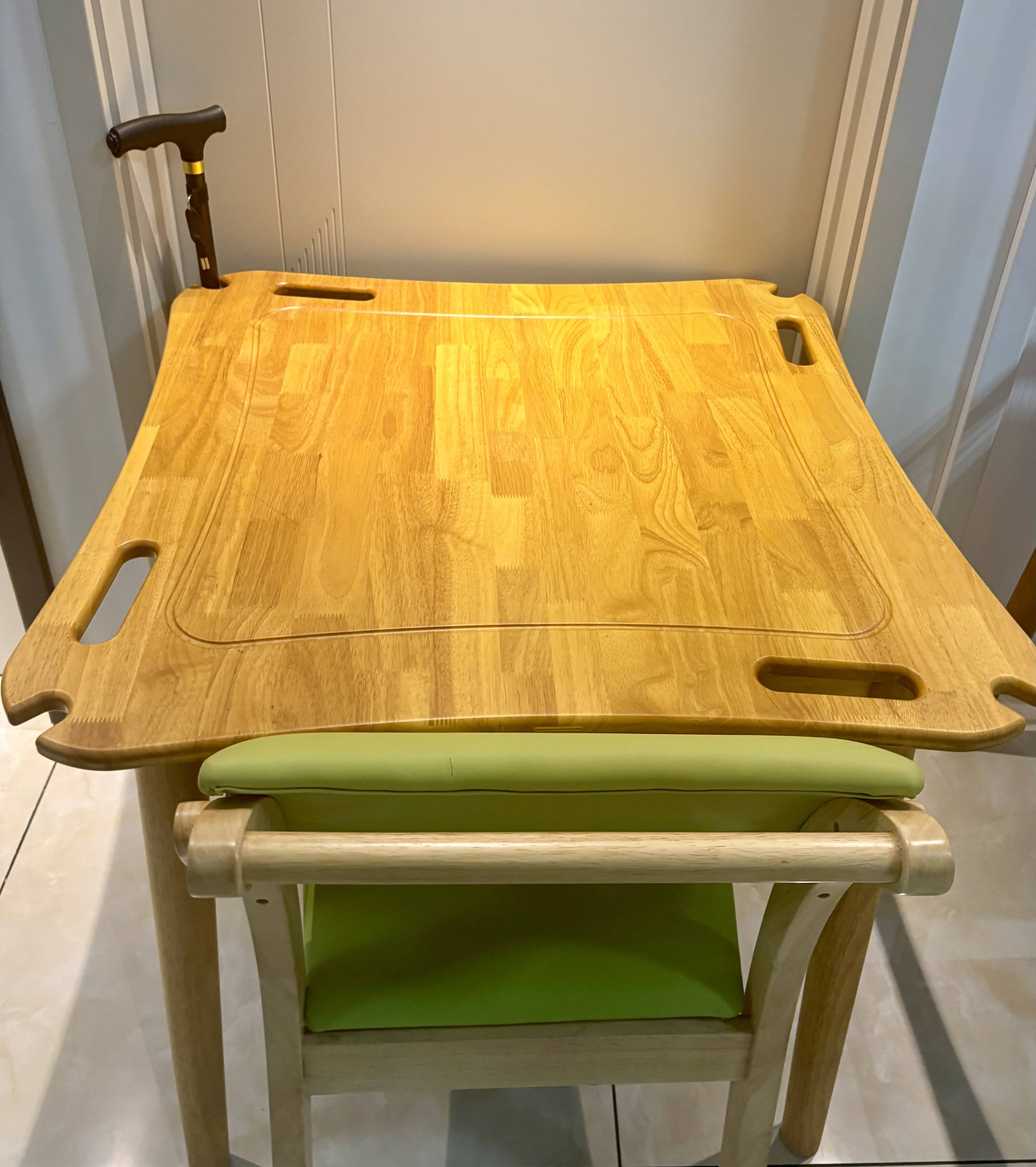 不断扩大的产品展示厅彰显卡派木业的拓宽之路,爱老护老的细节也体现在适老化产品中。比如,桌子的桌沿有方便借力的凹槽、椅子的椅背有放拐杖的圆孔、护理床增添了许多智能模块。“看着简单,却花了不少心思。”徐法钱指着一款护理床说,防侧滑设计、可调节餐桌板、静音脚轮等,都是从实际使用场景中摸索出来的。