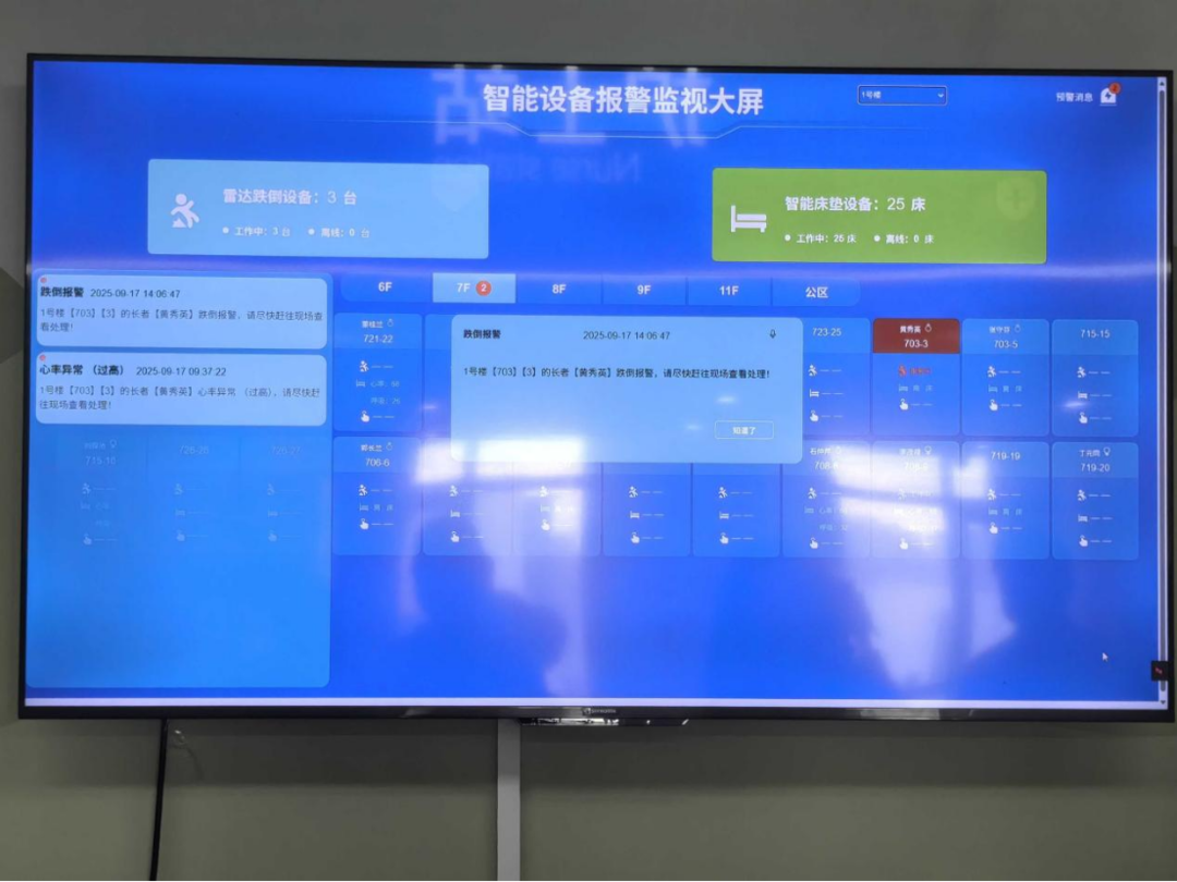 “这字,比上次更有力了!” 在山海瑞颐康养中心的书法室,护士正陪着 80 多岁的莒县老人王老先生练字。自入住以来,这间书法室成了他的 “心头好”,而真正让他 “住得踏实” 的,是遍布康养中心的智慧设备——护士站大屏上,外出、睡眠、跌倒风险数据实时更新;床垫下的监测装置精准记录离床时间并预警;床位雷达能瞬时判断跌倒情况、触发警报。