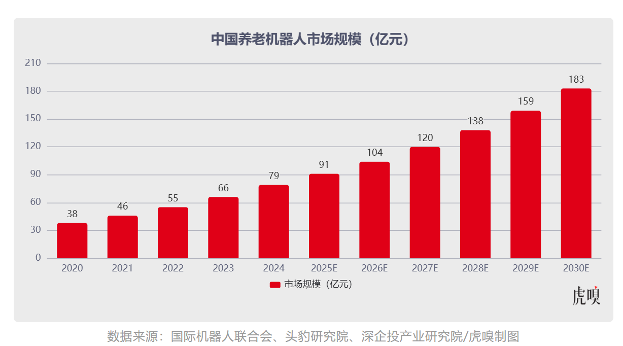 过去几年,养老机器人行业快速崛起。深企研究报告显示,2023年中国养老机器人市场规模约为66亿元。这相比国际机器人联合会(IFR)公布的2020年的数据38亿元,几乎增长了近一倍。到2030年这个数字还有望达到183亿元。