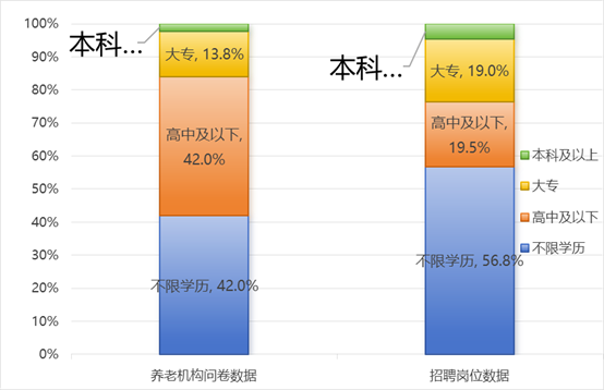 学历要求方面,问卷数据显示,42.01%的养老机构在人才招聘时不限学历;42.01%的养老机构要求应聘者具备高中学历;13.75%的养老机构要求学历在大专以上。招聘网站数据显示,56.83%的养老岗位不限学历,19.50%的岗位学历要求为高中。